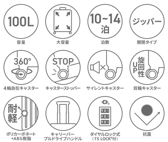 ace./エース/ACE/ace/ace.TOKYO/エーストーキョー/パリセイド3-Z/Palisades3-Z/パリセイド/スーツケース/キャリーケース/キャリーバッグ/ハードケース/ハード/100L/100リットル/Lサイズ/L/大容量/大型/大きめ/TSAロック/TSA/TSロック/4輪/双輪/ダブルキャスター/静音/静音キャスター/キャスターストッパー/抗菌/抗菌加工/軽量/軽い/10〜14泊/10泊/14泊/2週間/長期/長期旅行/国内旅行/海外旅行/海外/旅行/トラベル/出張/正規品/10年保証/保証/ブランド/メンズ/レディース/キャスターストッパー/ストッパー/かわいい/可愛い/おしゃれ