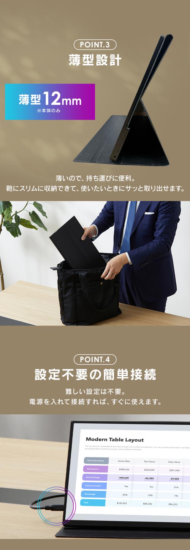 ビジネスシーンからプライベートまで、さまざまなシーンで活用できる薄型ポータブルモニター。