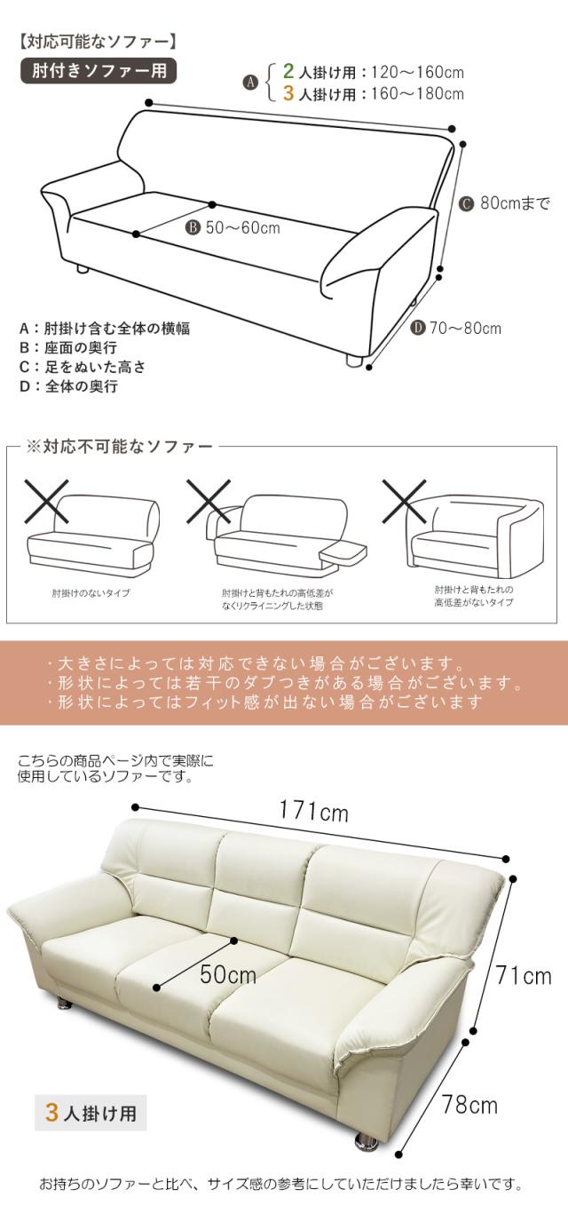 肘付き3人掛け用:幅160〜180cm×高さ70〜80cm(脚部分は除く)×奥行き70〜80cmまで