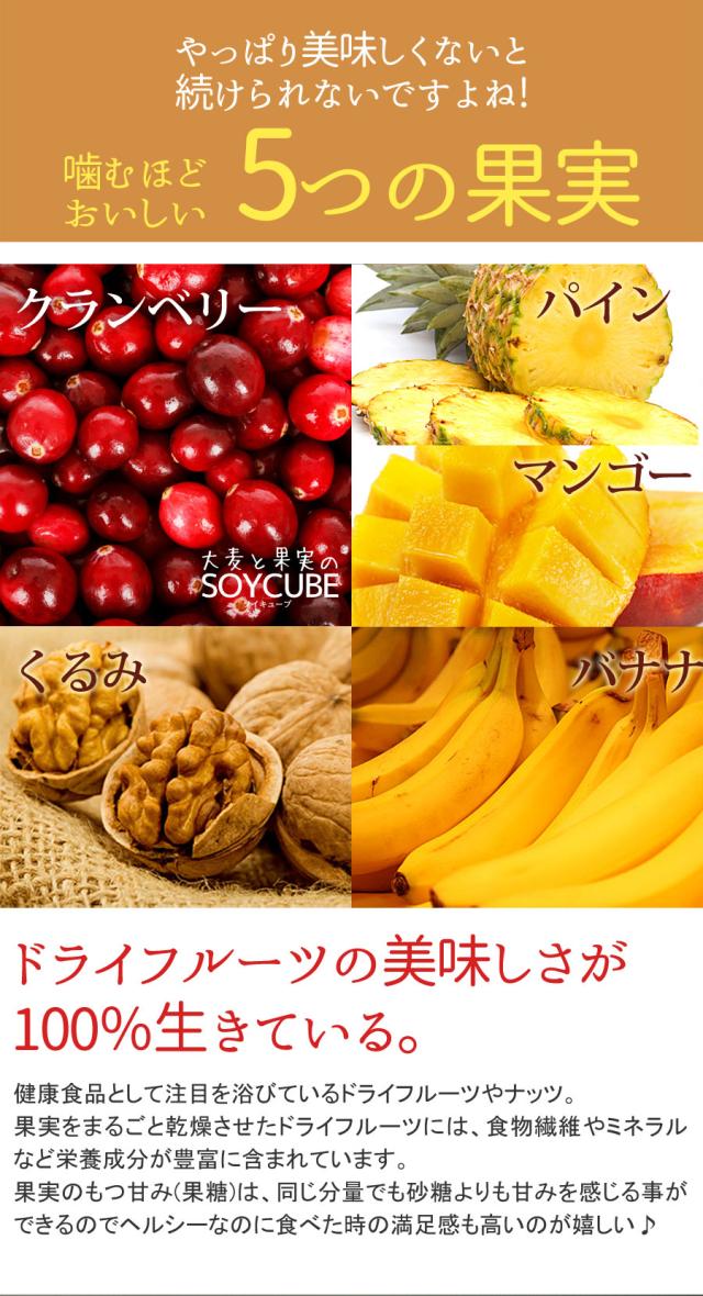 | 原材料 | 大豆粉(国内製造)、レーズン、砂糖、マーガリン、大麦粉、アーモンド、卵、準チョコレート、くるみ、ドライマンゴー、ドライバナナ、ドライパイナップル、ドライクランベリー、食塩/酸味料、乳化剤、香料、着色料(カロチン)、(一部に卵・乳成分・アーモンド・くるみ・大豆・バナナを含む) |