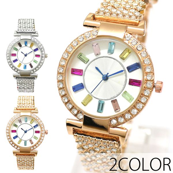 色とりどりのカラーストーンインデックスが輝くレディースウォッチです。ケース周りとベルト部分にはラインストーンがふんだんにあしらわれ、存在感抜群となっています。