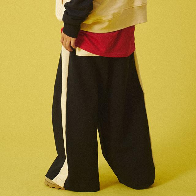 サイドのラインとバックのフラップポケットの生地の切り返しがアクセントのスウェットパンツ。