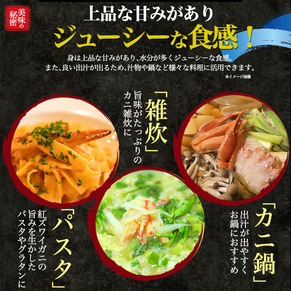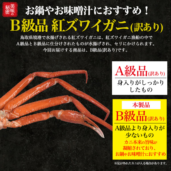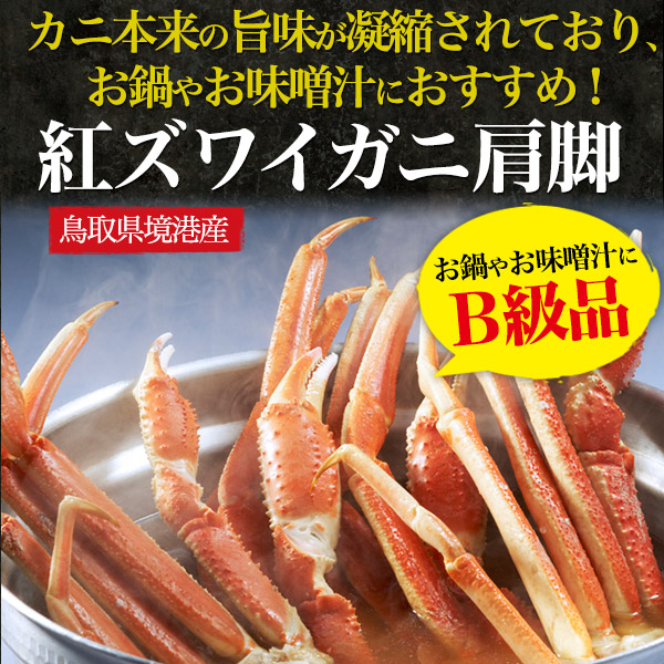 甘味たっぷりの鳥取県境港産をお届け!カニ本来の旨味が凝縮されており、お鍋やお味噌汁におすすめなB級紅ズワイガニ肩脚詰め合わせ。