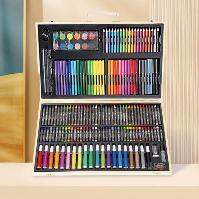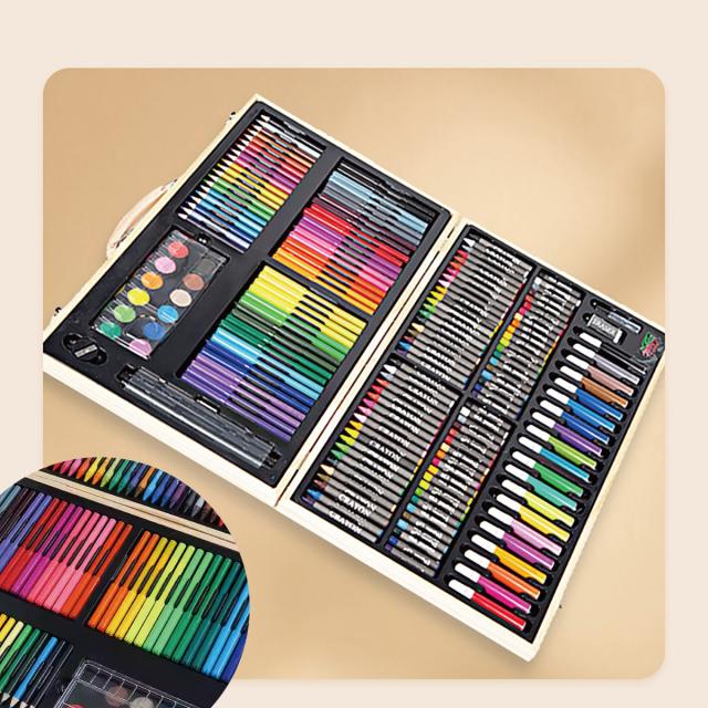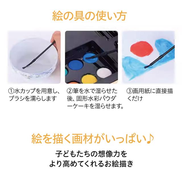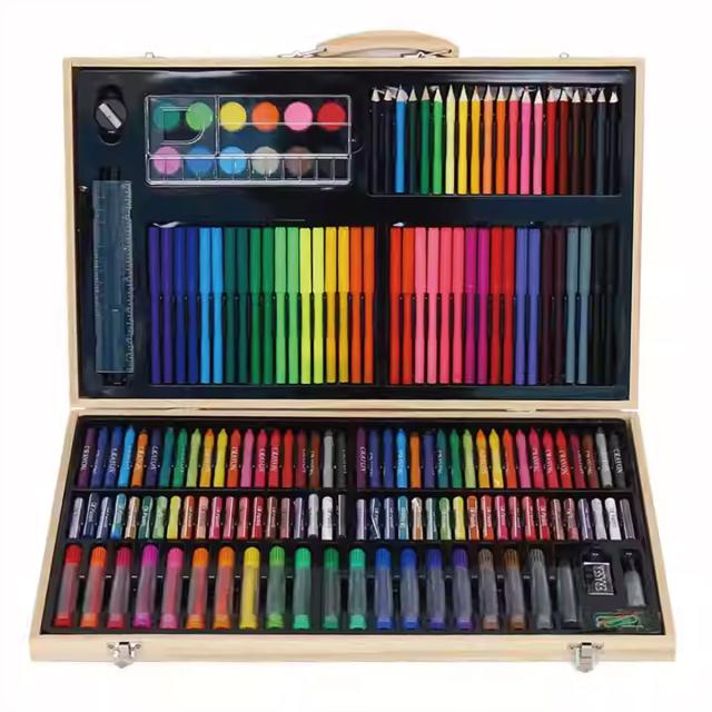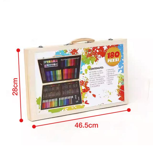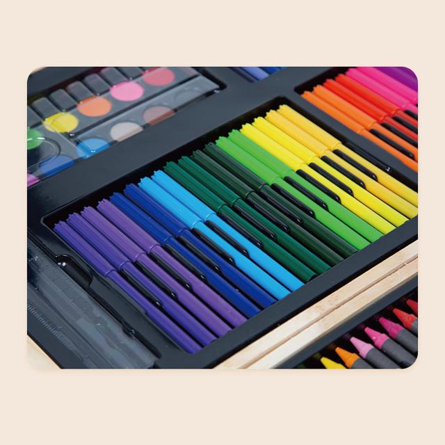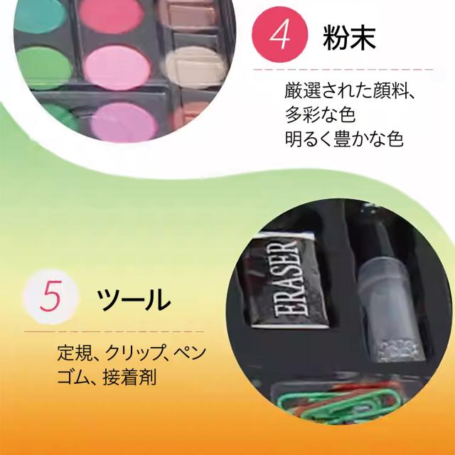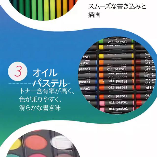 色鉛筆20色、クレヨン40色、水彩ペン56本、オイルパステル40本、パウダーケーキ12個、1パレット、粘着剤のボトル1本、ペーパークリップ5個、定規1個、鉛筆1本、鉛筆削り1個、消しゴム1個、トレースペン1本