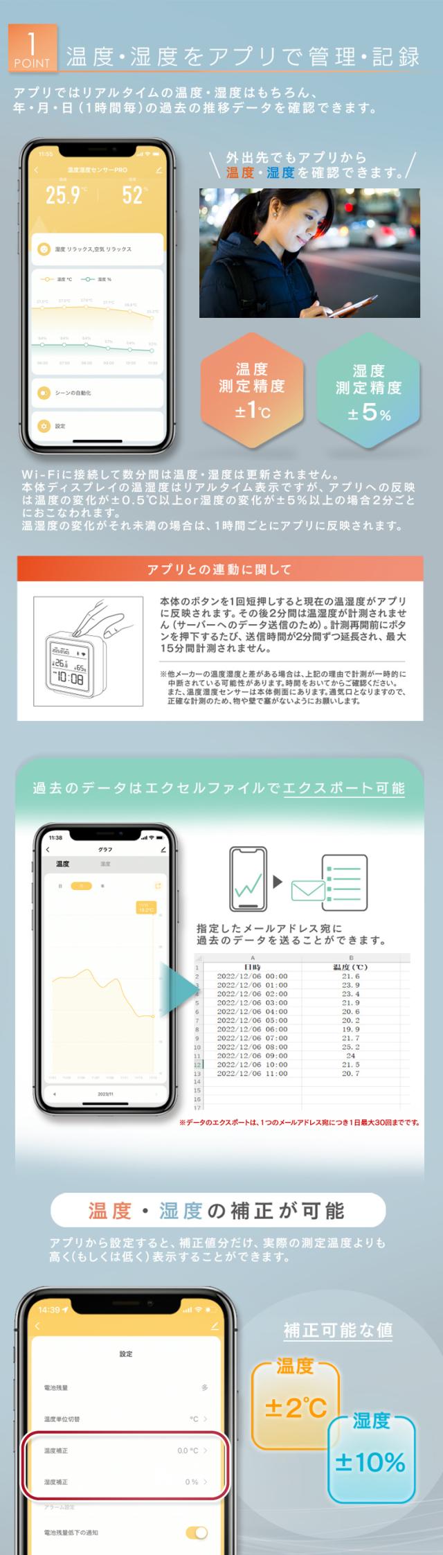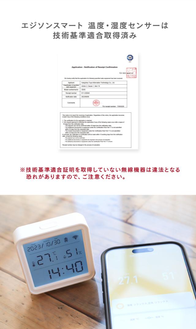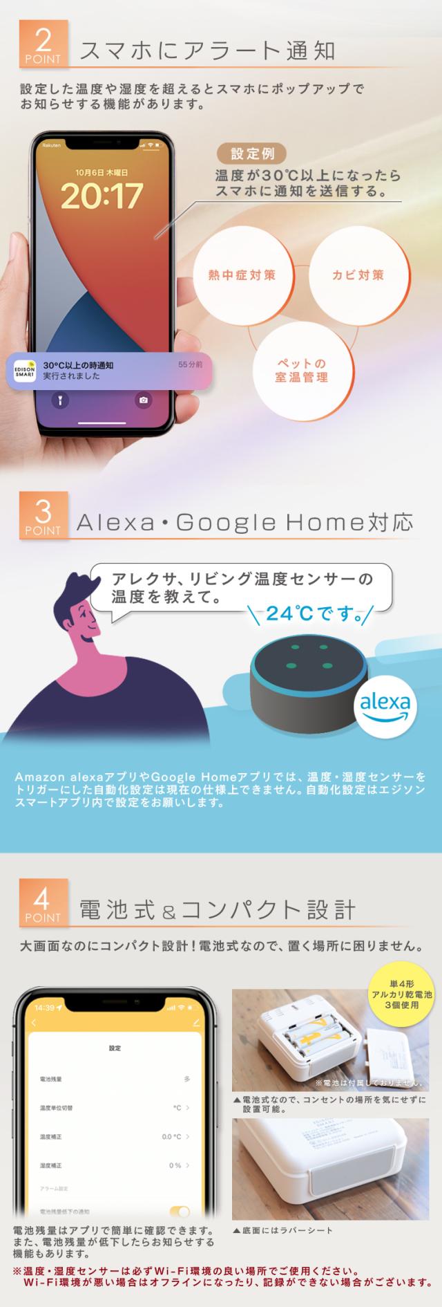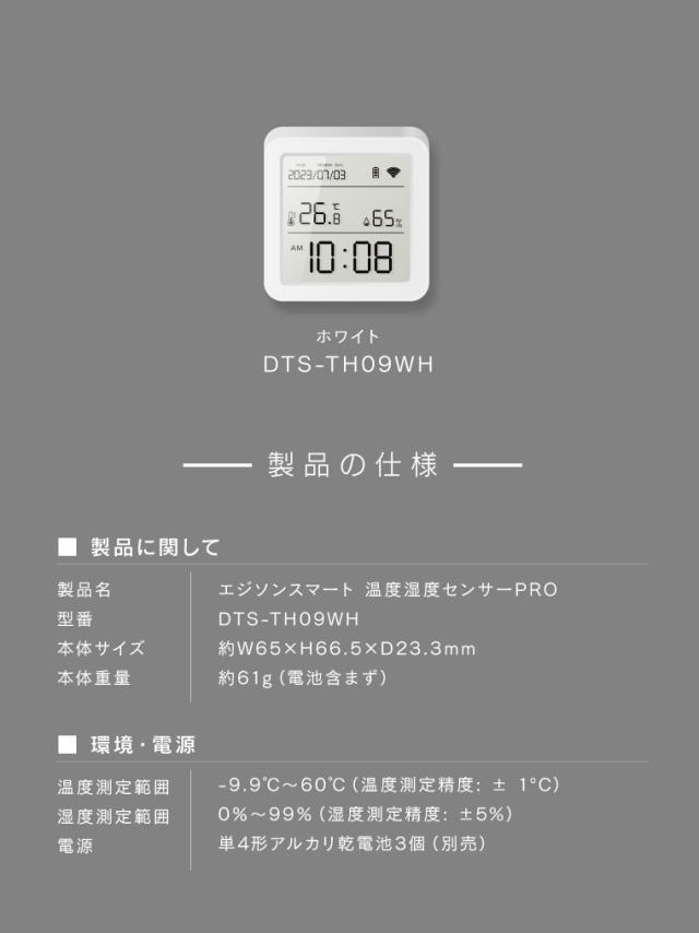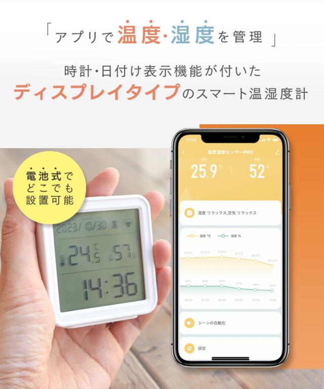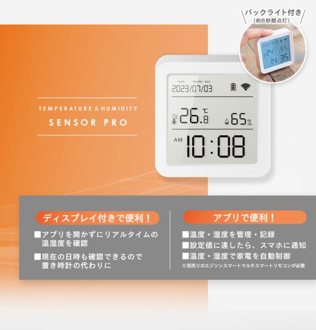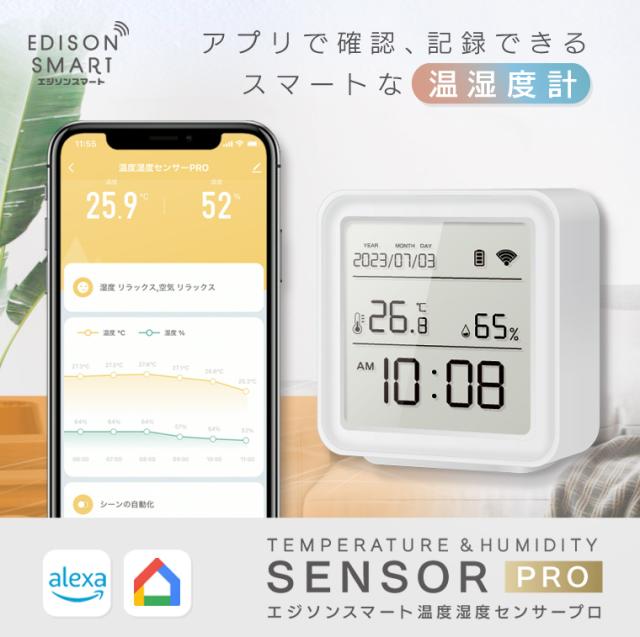 エジソンスマート 温度湿度センサーPRO ディスプレイ付き Wi-Fi アプリ管理 温度計 湿度計 補正機能付き プロモデル デジタル 置き時計 日付 カレンダー 日時 alexa Google Home 白 電池式 小型 バックライト スマホに通知 agesugi_sfp