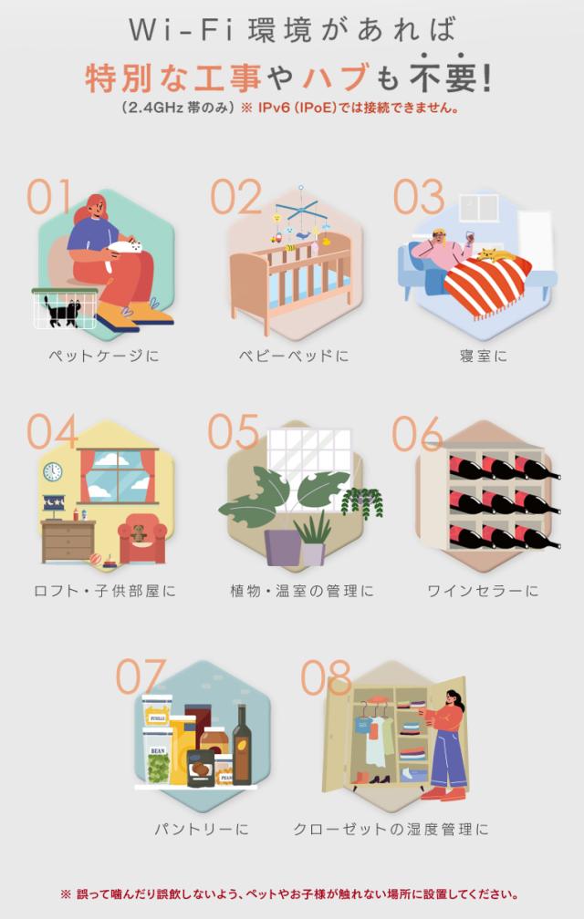 | 仕様 | ■環境・電源 ・電源:単4形アルカリ乾電池3個(別売) ・温度測定範囲: -9.9℃〜60℃(温度測定精度: ±1℃) ・湿度測定範囲:0%〜99%(湿度測定精度: ±5%) ■通信・ネットワーク ・通信方法:Wi-Fi ・使用周波数帯域:2.4GHz帯(5GHz帯では接続できません) ・準拠規格:IEEE 802.11b/g/n ・暗号化形式:WPA/WPA2 ・対応OS:iOS10.0以上/Android6.0以上 ・スマートスピーカー:Amazon Echo(Amazon Alexa)/Google Home(Google Assistant)対応 ・メーカー保証期間:1年間 ※IPv4にのみ対応(ネットワーク環境やWi-FiルーターがIPv6にしか対応していない場合はデバイス登録ができません。) 本製品は、国内電波法に基づく特定無線設備の技術基準適合証明などを受けた製品です。 |