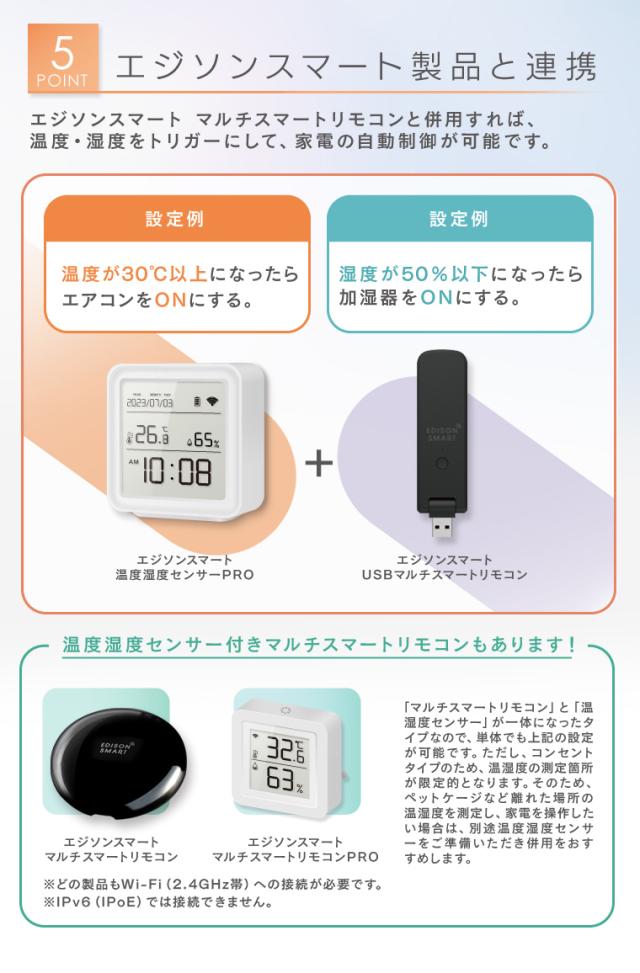 エジソンスマート マルチスマートリモコンと併用すれば、温度・湿度をトリガーにした家電の自動制御も可能です。