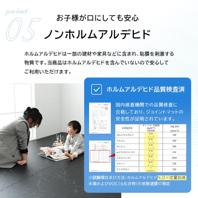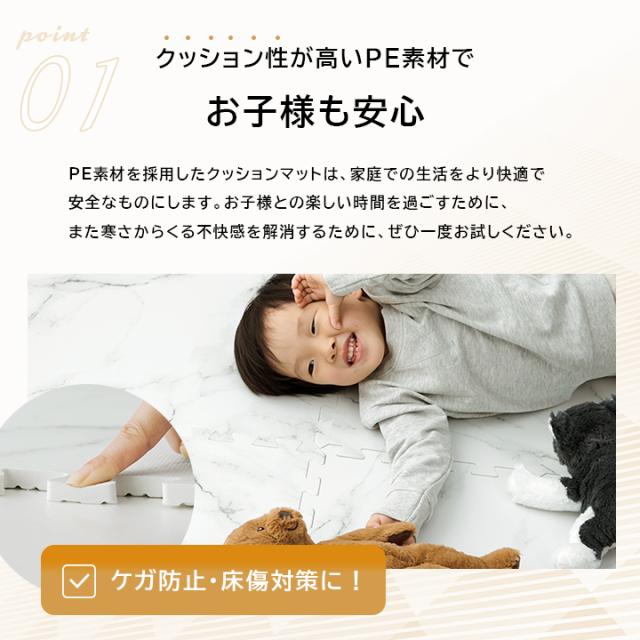 | ■おしゃれな大理石調デザインのジョイントマット。 ■程よい弾力性のあるPE素材のマットなので、座っても寝転がっても心地よいクッション性があります。 ■キズや衝撃に強いのでフローリングや子供部屋、ペットがいるご家庭に最適です。 ■冬場にひやっとするフローリングからの冷気を防ぐ保温性があります。 ■足音などを和らげる防音効果があるので、アパートなど階下への音が気になる方におススメです。 ■飲み物などをこぼしてもさっとひと拭きできるのでお手入れが簡単です。 ■大判サイズなので設置時間も短縮できます。 ※本商品は大理石調デザインのため、ジョイントマットをつなげた場合柄の位置が合いません。あらかじめ了承ください。 |