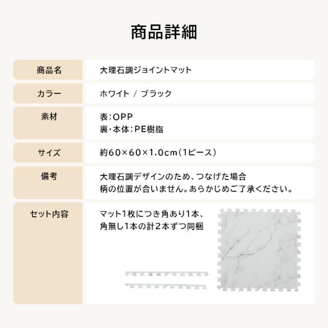 ・カラージョイントマット4枚セット ・カラージョイントマット16枚セット ・カラージョイントマット32枚セット ・カラージョイントマット64枚セット ・大理石調ジョイントマット32枚セット ・大理石調ジョイントマット64枚セット ・木目調ジョイントマット32枚セット ・木目調ジョイントマット64枚セット |