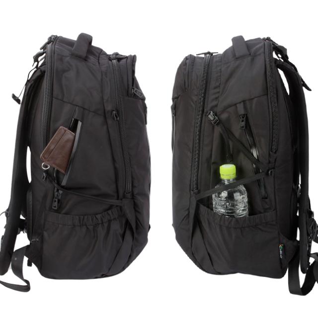 両サイド下部にオープンポケット。左側上部にはパスケースが収まるファスナーポケット。右側上部はメイン収納に直接アクセス可能なファスナーを装備。