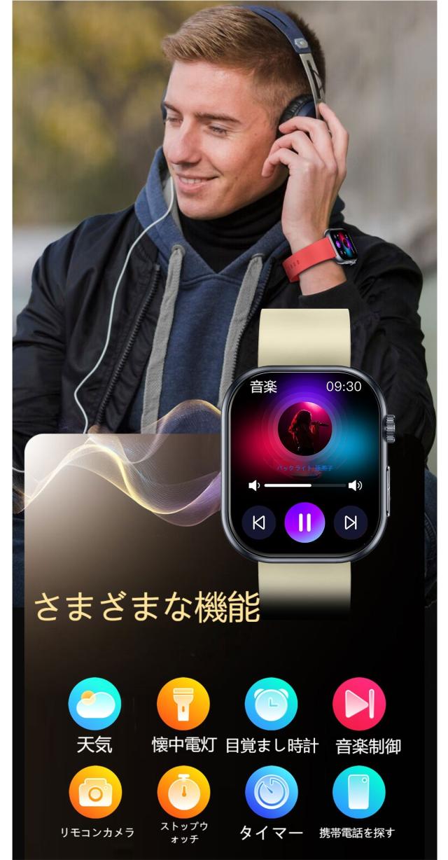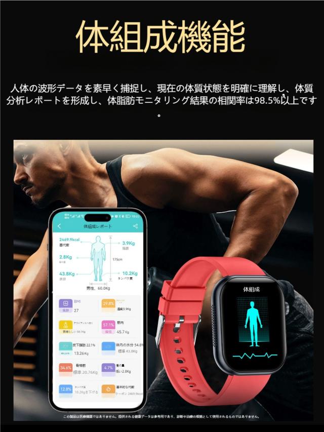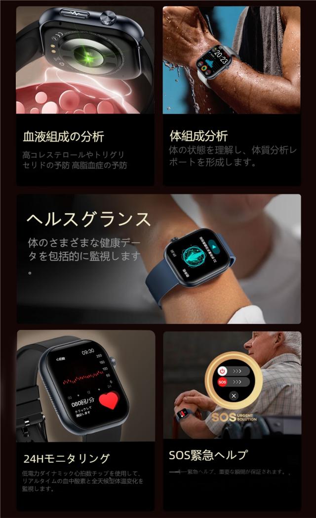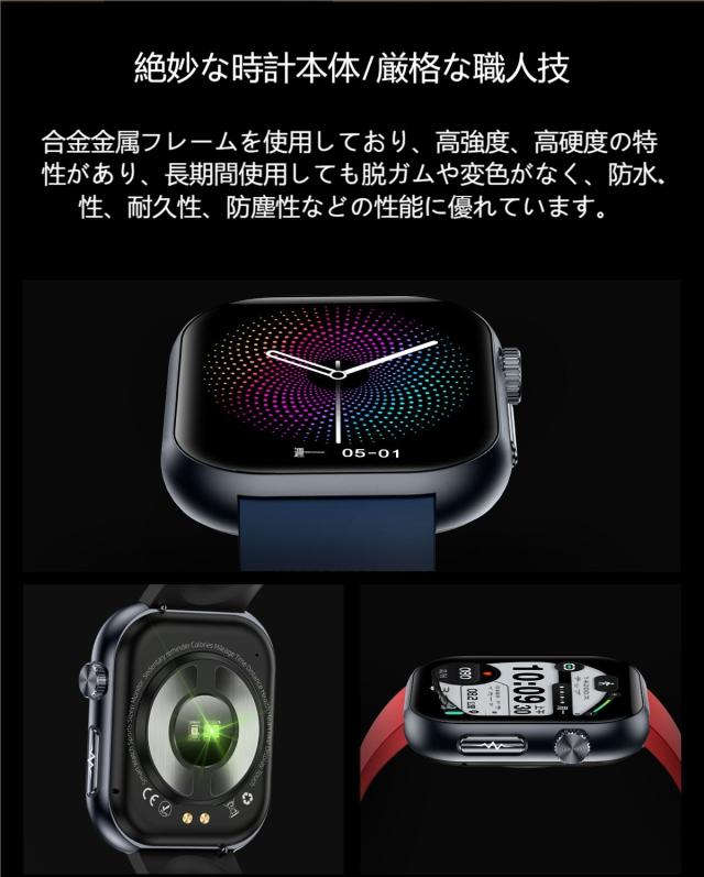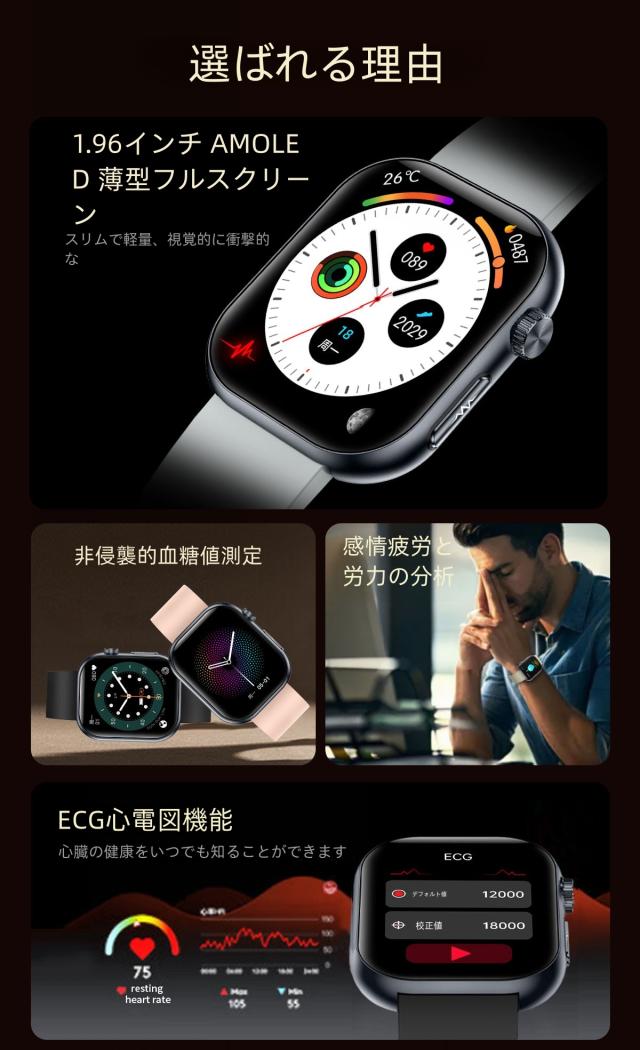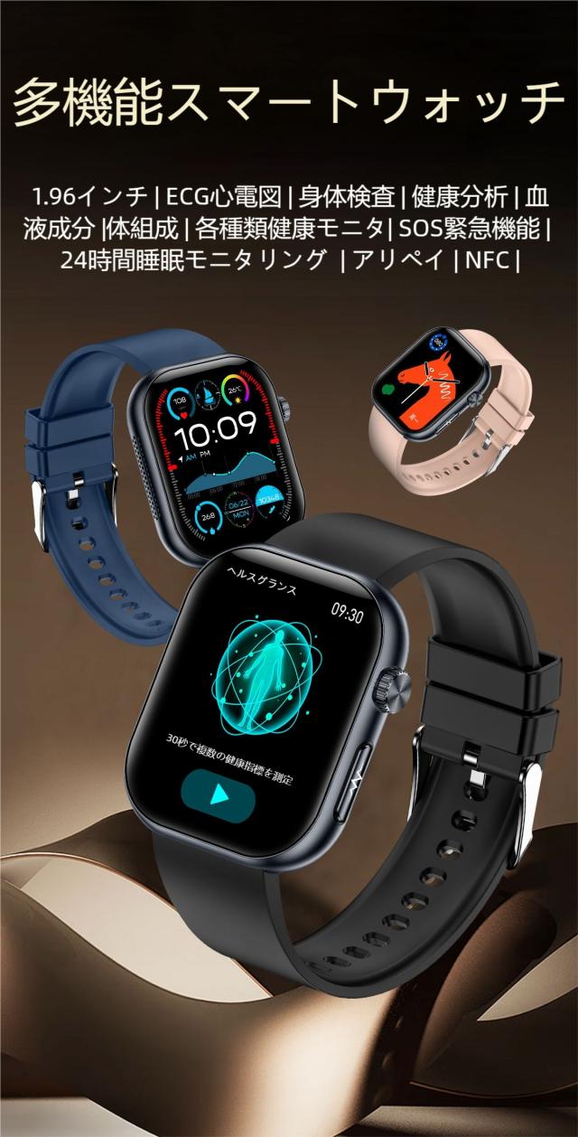 【1年保証】スマートウォッチ 1.96インチ大画面 ECG心電図 血糖値測定 体温 血圧 血中酸素 睡眠モニタ 体組成 通話 血中酸素 活動量計 心拍計 健康管理 運動 腕時計 レディース メンズ 着信通知 メッセージ通知 IP68防水 line 対応 人気 日本語説明書付き