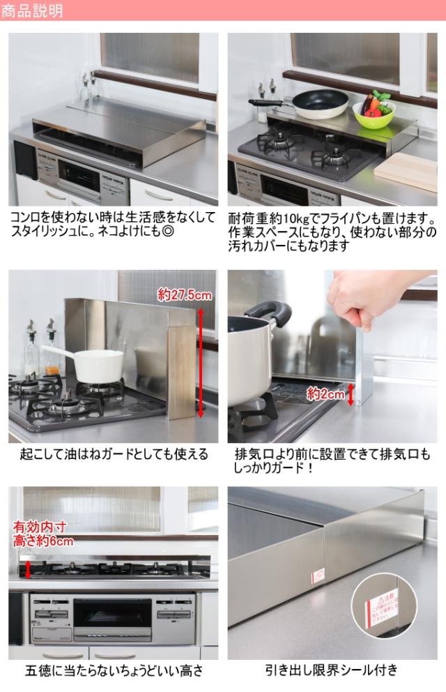 前後伸縮式で用途に合わせてハーフ〜フルカバーできるコンロカバー。 全部引き出して、コンロ全体をフルカバーして目隠しや猫除けとして。 半分の状態でフライパン置きや、作業台の延長で調味料や調理小物をちょい置き。 排気口の手前に立てかけて排気口カバーや油ハネガードとして。 1台で6役の賢いアイテム! 材質はステンレス製でサビに強く長持ちします。 60cmタイプのビルトインコンロに余裕で収まるサイズです。 使う前に保護用のブルーシートをはがしてご使用ください。 (限界シールのみ貼ってください) |