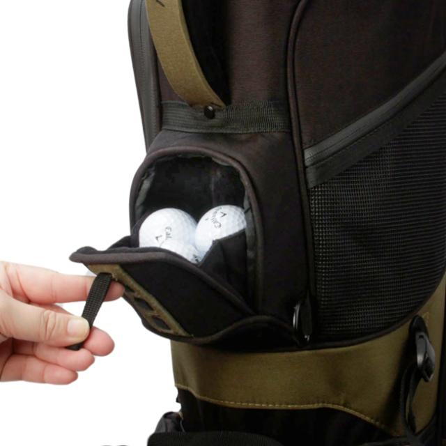 左側は、スコアカードもしまえるファスナーポケット。右側には、視認性の高いメッシュ素材のファスナーポケットを配置。