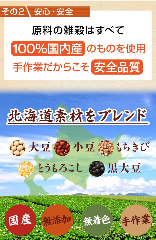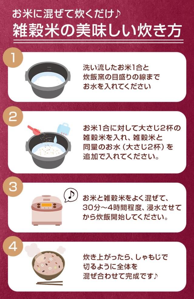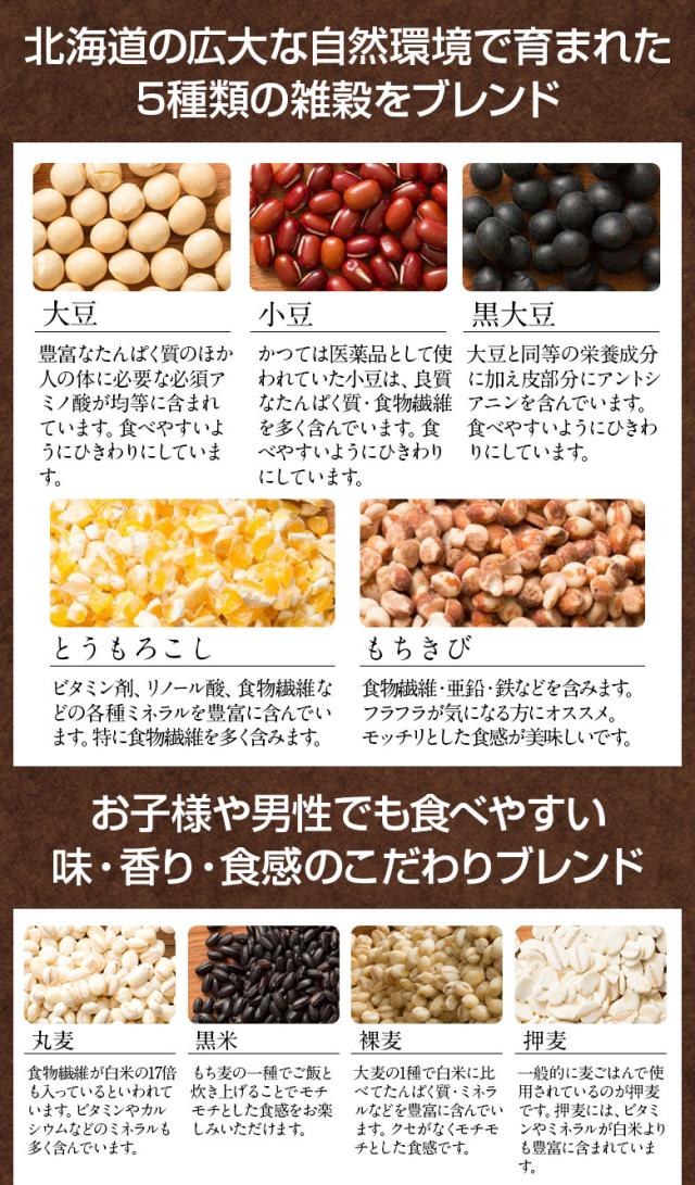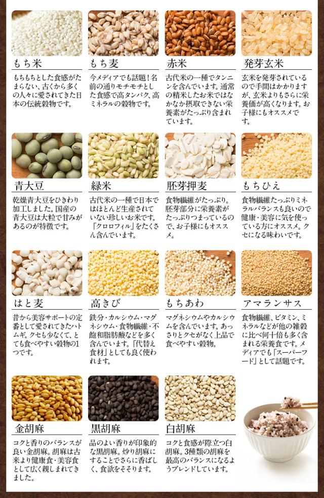 【原材料名】丸麦、黒米、裸麦、押麦、大豆、もち麦、もち米、赤米、発芽玄米、青大豆、緑米、小豆、胚芽押麦、もちきび、もちひえ、はと麦、とうもろこし、高きび、黒大豆、もちあわ、アマランサス、金胡麻、黒胡麻、白胡麻(一部に大豆・ごまを含む)