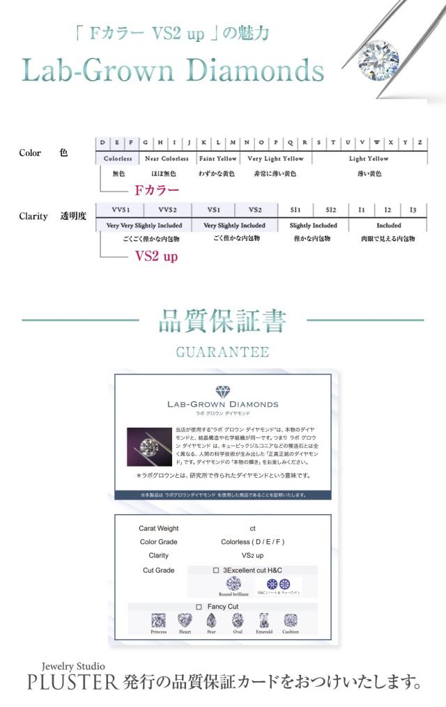 Jewelry Studio PLUSTER が使用する" ラボ グロウン ダイヤモンド "(ラボグロウンとは「研究所で作られたダイヤモンド」という意味です)は、本物のダイヤモンドと、結晶構造や化学組成が同一です。つまり、ラボグロウンダイヤモンドはキュービックジルコニアなどの模造石とは全く異なる、人間の科学技術が生み出した正真正銘のダイヤモンドです。ダイヤモンドの「本物の輝き」をお楽しみください。