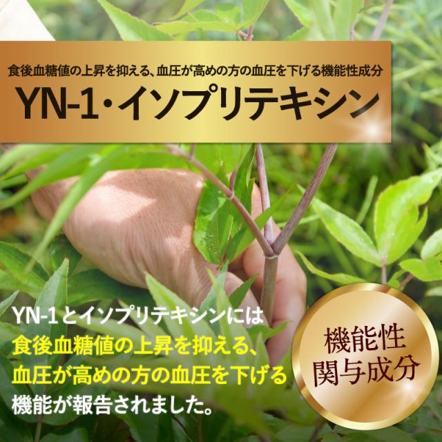 | 届出表示 | 本品には、YN-1(イソエポキシプテリキシン)とイソプテリキシンが含まれています。YN-1(イソエポキシプテリキシン)とイソプテリキシンには食後血糖値の上昇を抑える機能、血圧が高めの方の血圧を下げる機能が報告されています。 |