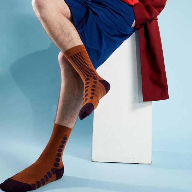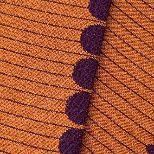 私たちのシグネチャーデザイン ボーダーとドット柄を用いたエッグプラントドットソックスです。