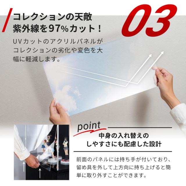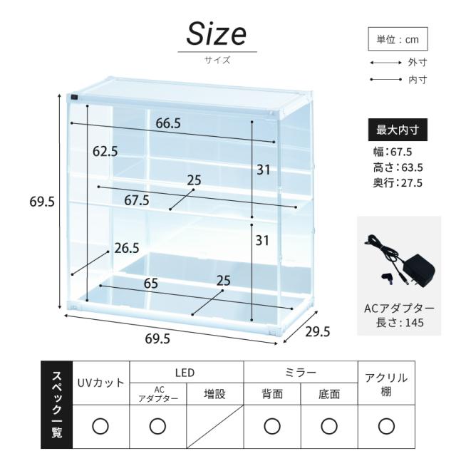 ジェイステージ jstage j-stage フィギュアケース コレクションケース ディスプレイケース アクリルケース UVカット 紫外線カット アクリル フィギュア フィギア ガンプラ モンコレ 一番くじ ゴジラ 色あせ防止 大型 でかい 積み重ね 横型 横型タイプ 卓上 安い おしゃれ 人気 約 幅70 高さ70 奥行30 cm 背景ミラー 底面ミラー 下ミラー ミラー 鏡 LED ライト 照明 led照明