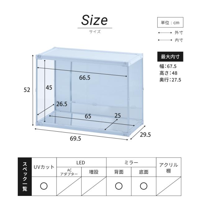 ジェイステージ jstage j-stage フィギュアケース コレクションケース ディスプレイケース アクリルケース UVカット 紫外線カット アクリル フィギュア フィギア ガンプラ モンコレ 一番くじ ゴジラ 色あせ防止 大型 でかい 積み重ね 横型 横型タイプ 卓上 安い おしゃれ 人気 約 幅70 高さ50 奥行30 cm 背景ミラー 底面ミラー 下ミラー ミラー 鏡