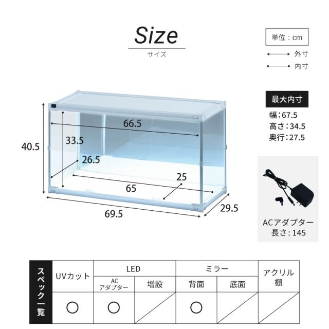 ジェイステージ jstage j-stage フィギュアケース コレクションケース ディスプレイケース アクリルケース UVカット 紫外線カット アクリル フィギュア フィギア ガンプラ モンコレ 一番くじ ゴジラ 色あせ防止 大型 でかい 積み重ね 横型 横型タイプ 卓上 安い おしゃれ 人気 約 幅70 高さ40 奥行30 cm 背景ミラー ミラー 鏡 LED ライト 照明 led照明