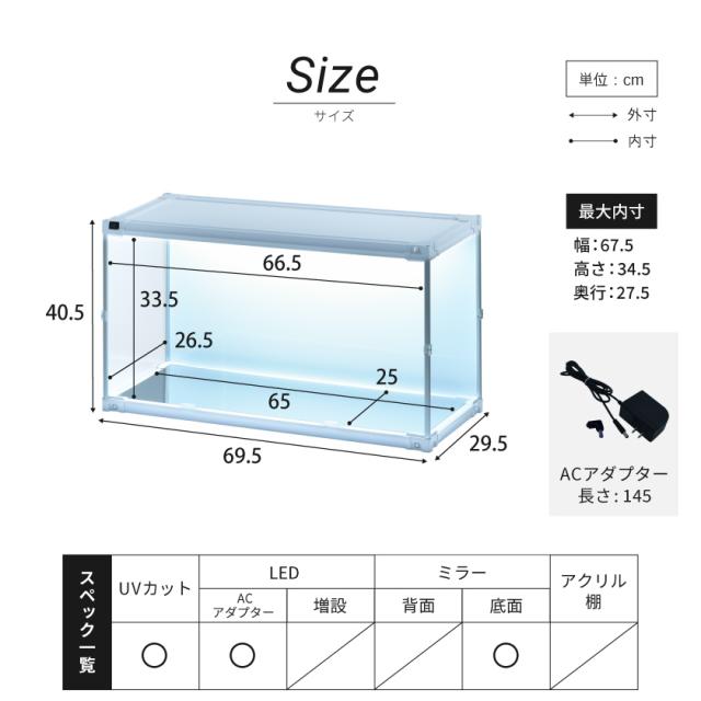 ジェイステージ jstage j-stage フィギュアケース コレクションケース ディスプレイケース アクリルケース UVカット 紫外線カット アクリル フィギュア フィギア ガンプラ モンコレ 一番くじ ゴジラ 色あせ防止 大型 でかい 積み重ね 横型 横型タイプ 卓上 安い おしゃれ 人気 約 幅70 高さ40 奥行30 cm 底面ミラー 下ミラー ミラー 鏡 LED ライト 照明 led照明