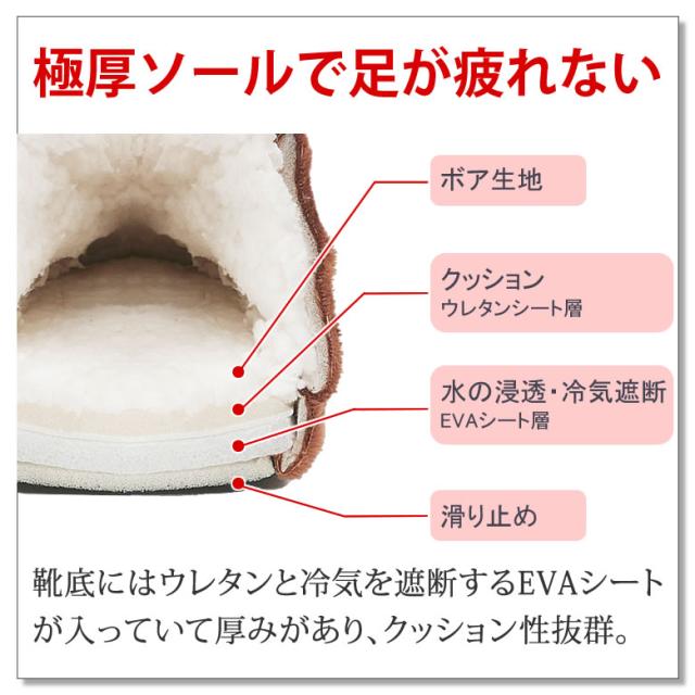 ソールには冷気を遮断するEVAシートの層と、クッション性の高いウレタンシートの層が入っており、厚みがあるで底冷えをシャットアウトしながら、長時間履いても足が痛くならない。