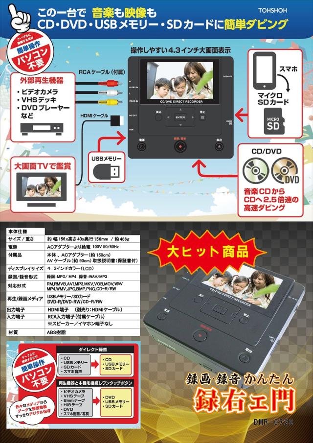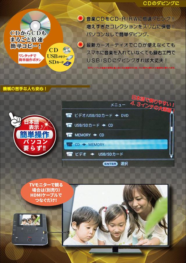 商品詳細: この一台で音楽も映像もCD/DVD/USB/SDにワンタッチ簡単ダビング!お子様の成長の記録や旅行の思い出など色々なメディアからデータを整理整頓すっきり半永久的にデジタルダビング保存ができる!VHSテープ、8mmテープ、Hi8テープなどをDVD/USBメモリー/SDカードにデジタルダビング。CD⇒USBメモリー/SDカードにダビング、CD⇒CDは2.5倍速の高速ダビング。USBメモリー/DVD/CDに録音、録画が可能。TVチューナー内蔵機器と接続でTV番組も録画ができる。TVモニターとの接続でダビングした映像を大画面で観覧することができます。操作しやすい4.3インチ大画面表示。録音、録画したメディアは他のプレーヤー、PCで再生することができます。