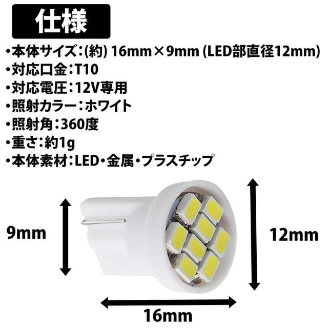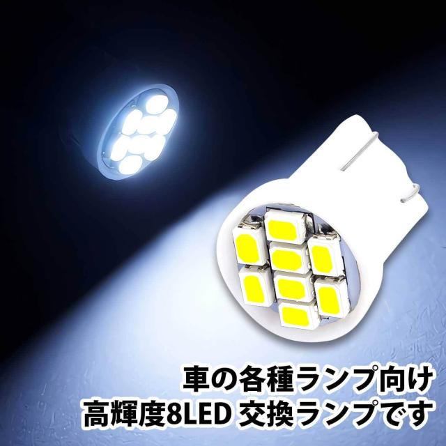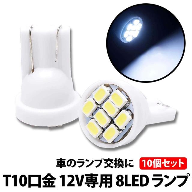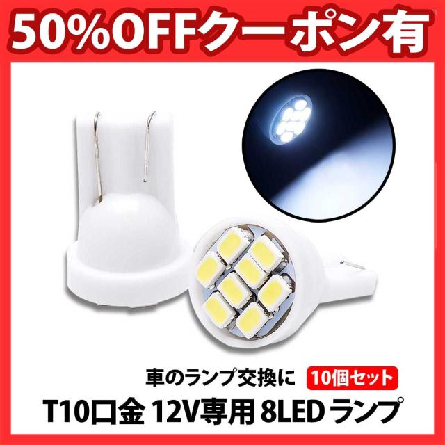 50%offクーポン有 LEDバルブ T10 8連 10個 セット ホワイト 高輝度LED 12V専用 白光 ウエッジ球 バルブ 発光 ナンバープレート 室内灯 ルームライト 車 ポジション球 ヘッドライト ナンバーライト バイク 車内ランプ メーター球 LEDナンバー灯 LEDポジション球 高輝度