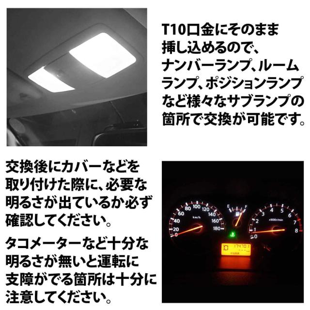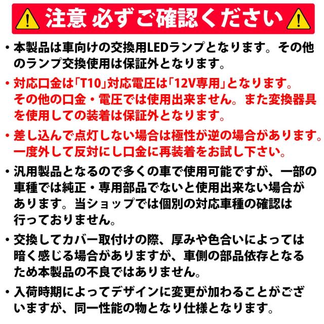 ・対応口金は「T10」対応電圧は「12V専用」となります。その他の口金・電圧では使用出来ません。また変換器具を使用しての装着は保証外となります。