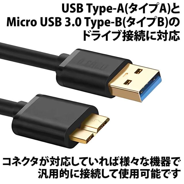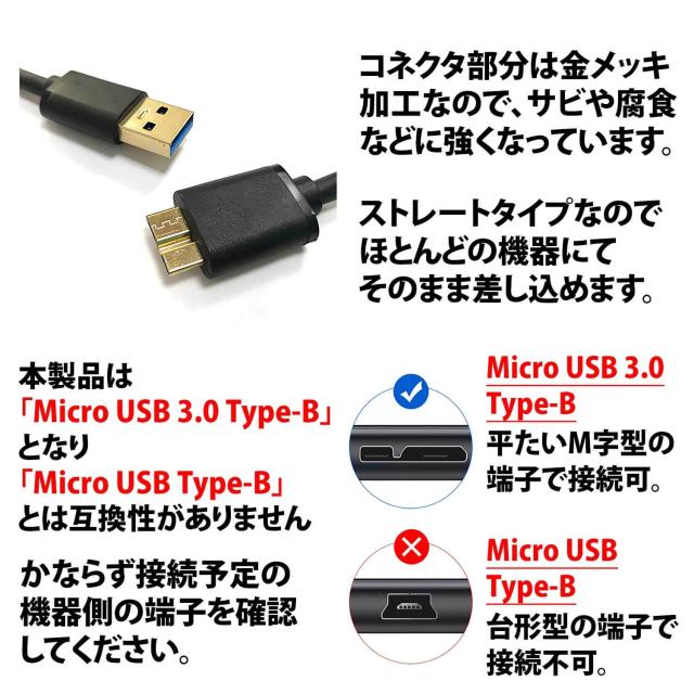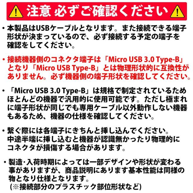 ・「Micro USB 3.0 Type-B」は規格で制定されているためほとんどの機器で汎用的に使用可能です。ただし極まれに端子形状が同じでも専用ケーブル以外動作しない機器もあるため、機器の仕様を確認してください。