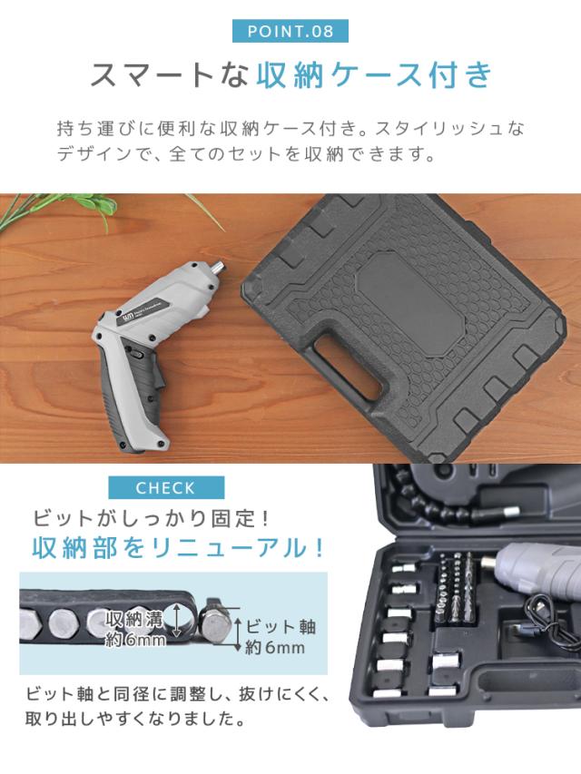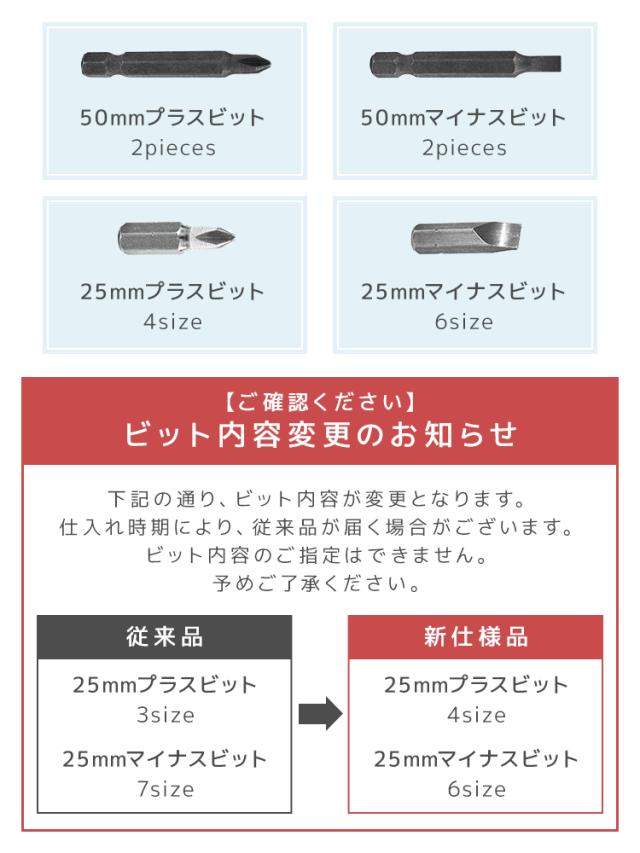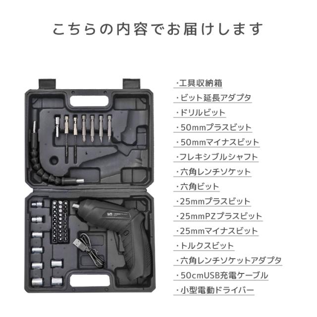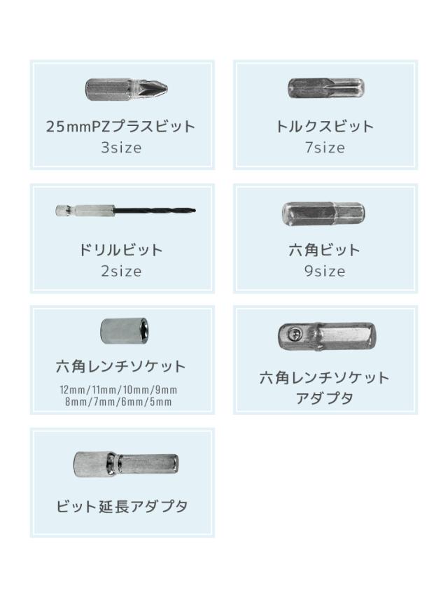 | 内容 | ・小型電動ドライバー ・工具収納箱×1 ・ビット延長アダプタ×1 ・50cmUSB充電ケーブル×1 ・25mmプラスビット×3 ・25mmPZプラスビット×3 ・25mmマイナスビット×7 ・50mmプラスビット×2 ・50mmマイナスビット×2 ・トルクスビット×7 ・ドリルビット×2 ・フレキシブルシャフト×1 ・六角レンチソケット×8 ・六角ビット×9 ・六角レンチソケットアダプタ×1 ・日本語説明書 |