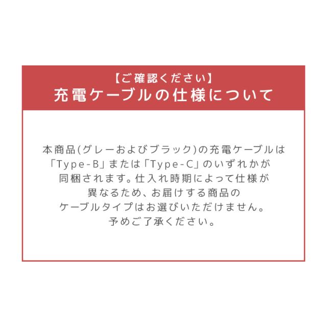 ・使用中は充電ケーブルを抜いてください。 ・充電時間は5時間を超えないようにしてください。 ・高温多湿な場所を避け、乾燥した場所で保管してください。 ・壁の穴あけ、鉄板の穴あけ、銅板の穴あけにはお勧めしません。 ・グレーおよびブラックの充電ケーブルは、「Type-B」または「Type-C」のいずれかが同梱されます。仕入れ時期によって仕様が異なるため、お届けする商品のケーブルタイプはお選びいただけません。予めご了承ください。 ・商品は、モニターによって色合いが異なって見える場合があります。 ・仕様、サイズ、デザイン、カラーは改良のため予告なく変更することがあります。 |