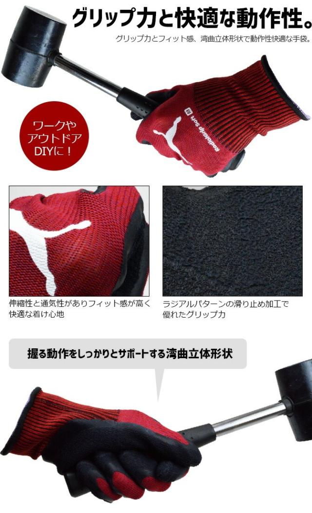 | リーディングスポーツブランドPUMA(プーマ)のテクノロジーがふんだんに注ぎ込まれた作業用手袋「PUMA 3D GLOVES シリーズ」の「ラジアルグリップ ソフト」です。 ラジアルパターンが生み出す確かなグリップ力と湾曲立体仕様で握る動作をしっかりサポートします。 建設現場や工場はもちろんのこと、DIY・アウトドアなどでのさまざまな用途で作業の効率を高め、洗練されたデザインは精悍な手元を演出します。 | ||||||