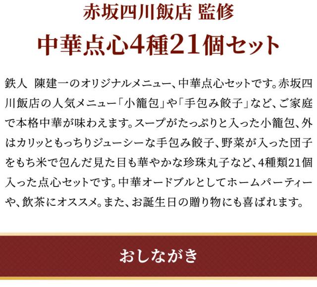 赤坂四川飯店監修 中華点心4種21個セット お歳暮 餃子 小籠包 点心 珍珠丸子 中華 惣菜 湯煎 冷凍 簡単調理 お取り寄せ グルメ 御礼 内祝い お誕生日 プレゼント ギフト