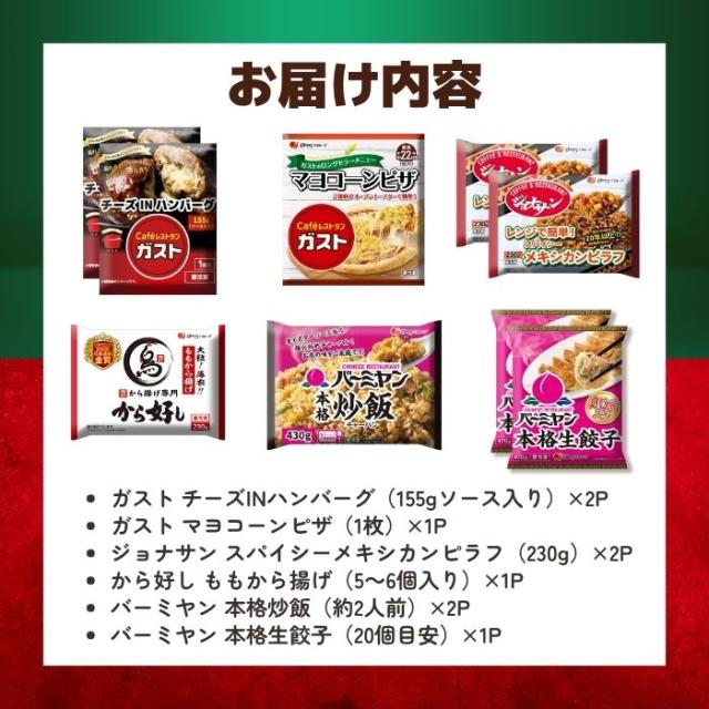 ●ガスト チーズインハンバーグ(155gソース入り)×2●ガスト マヨコーンピザ(300g)×1●バーミヤン 本格冷凍生餃子(470g/目安20個)×2●バーミヤン 本格炒飯(430g)×1●ジョナサン スパイシーメキシカンピラフ(230g)×2●から好し ももから揚げ(230g/目安5個〜6個)×1