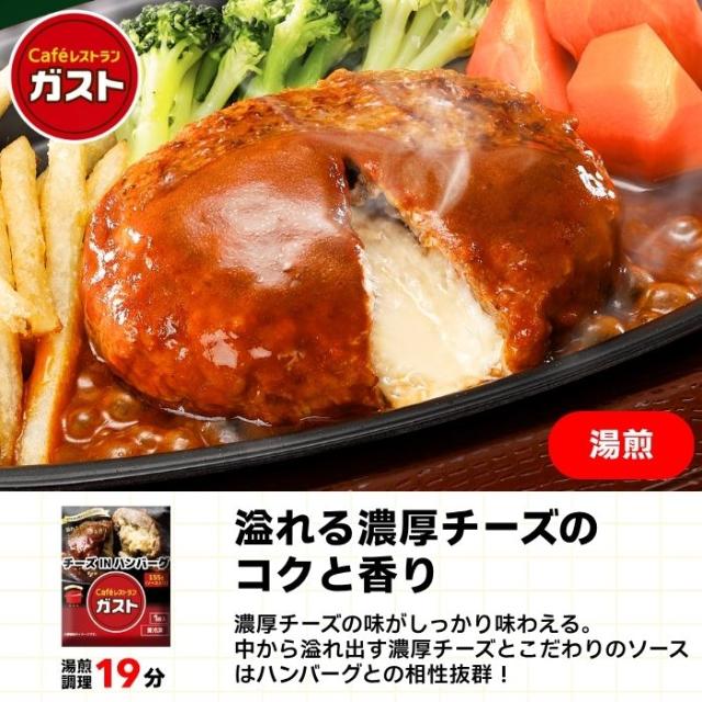 【ガスト チーズインハンバーグ(155gソース入り)】ハンバーグ【食肉[牛肉(豪州産)、豚肉]、たまねぎ、豚かしら肉、つなぎ(パン粉、液卵白)、ナチュラルチーズ、乳等を主要原料とする食品(植物油脂、チーズ、牛乳、ホエイパウダー、脱脂粉乳、乳蛋白、デキストリン、寒天、食塩)、乳たん白、食塩、香辛料、果実調味料(梅酢、食塩、発酵調味料)、植物油脂/ 増粘剤(加工澱粉)、pH調整剤、ポリリン酸Na、香料、カロチノイド色素】、デミグラスソース【ソテーオニオン、トマトペースト、デミグラスベース、牛脂、植物油脂、小麦粉、醤油、醸造調味料、トマトケチャップ、砂糖、食塩、香辛料 / カラメル色素、調味料(アミノ酸等)、D-キシロース、ビタミンB?、香料、酸化防止剤(V.E)】、(一部に小麦・乳成分・卵・牛肉・大豆・鶏肉・豚肉を含む)