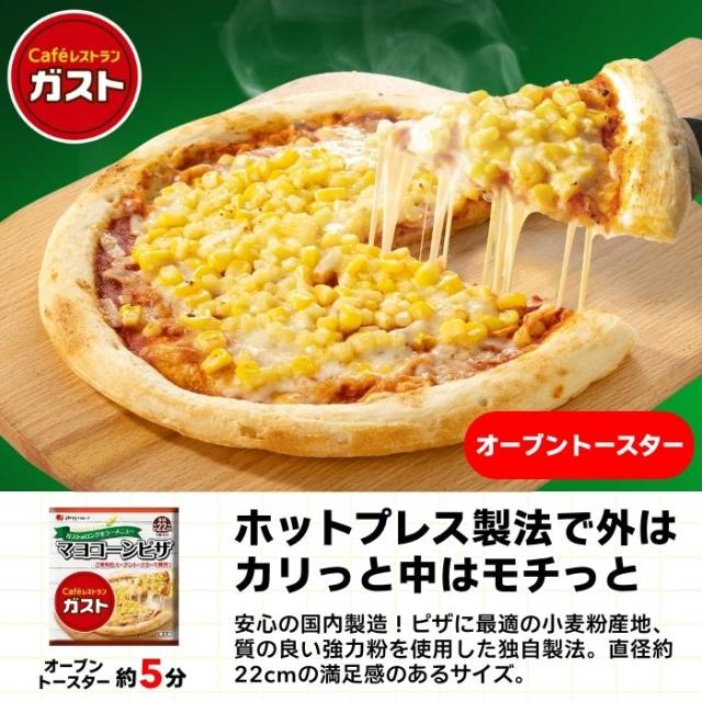【ガスト マヨコーンピザ(1枚)】ピザクラスト(小麦粉、ショートニング、砂糖、植物油脂、イースト、食塩)、とうもろこし、トマトソース、ナチュラルチーズ、マヨネーズ風油脂加工食品(植物油脂、醸造酢、砂糖・ぶどう糖果糖液糖、ゼラチン、卵黄、食用精製加工油脂、その他)/加工デンプン、酸味料、増粘剤(キサンタンガム)、(一部に小麦・卵・乳成分・ゼラチン・大豆を含む)