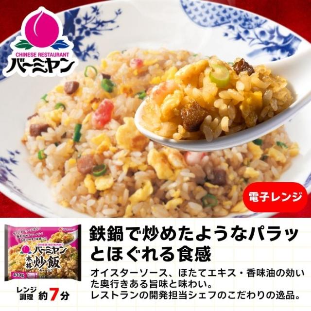 【バーミヤン 本格炒飯(430g)】米(国産)、液卵、焼豚、かに風味かまぼこ、みりん、ねぎ、ショートニング、食塩、しょうゆ、還元水あめ、ウスターソース、でん粉、ほたて貝エキス、オイスターソース、しょうがペースト、中華調味料、香辛料、ぶどう糖、いため油(なたね油、こめ油)/調味料(アミノ酸等)、加工でん粉、着色料(カラメル、紅麹、カロチノイド)、甘味料(カンゾウ、ステビア)、酸味料、貝Ca、(一部に小麦・卵・乳成分・ごま・大豆・鶏肉・豚肉を含む)