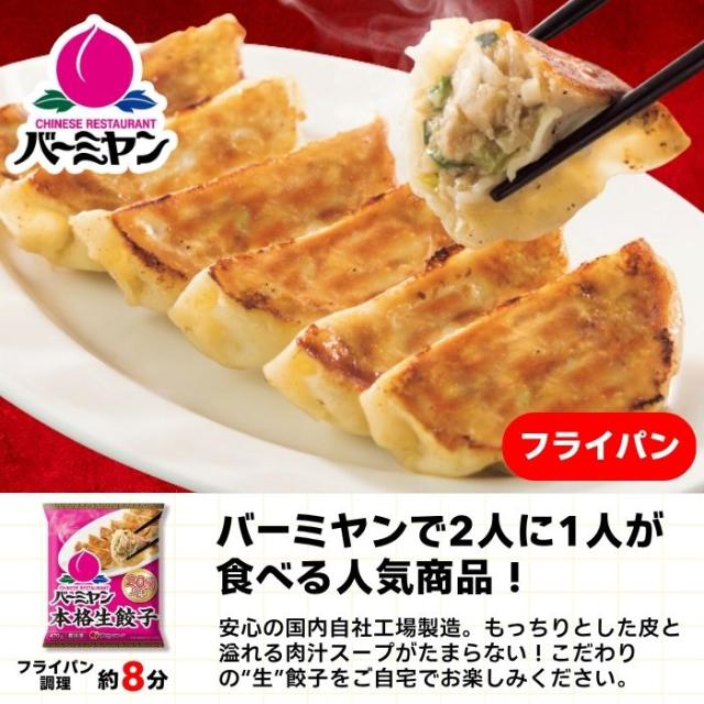 【バーミヤン 本格冷凍生餃子(470g/目安20個)】野菜(キャベツ、にら、生姜、にんにく)、豚背脂、豚肉、ねぎ油、胡麻オイル、酒、鶏卵、中華スープの素、醤油、砂糖、食物繊維、塩、コショウ、皮(小麦粉(国内製造)、粉末油脂、乳化油脂、塩)/加工デンプン、調味料(アミノ酸等)、(一部に小麦・卵・乳成分・オレンジ・大豆・鶏肉・豚肉・ごまを含む)