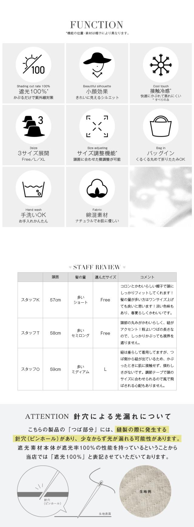 - 形も可愛くFreeサイズの調節は簡単で良かったです。 裏地はメッシュでひんやり感じました。暑い日には普通の帽子より熱を遮ってくれています。 生地がシッカリしてるのでお店や電車内のクーラー直撃極寒ポイン...