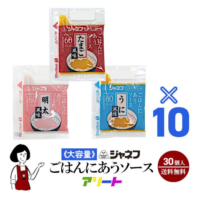 ごはんにあうソースアソート【大容量】3種類×10個(30個入)/メール便 送料無料 ジャネフ うに風味 たまご風味 明太風味 アウトドア キャンプ 保存食 時間短縮 病院食 高カロリー食 こわけや