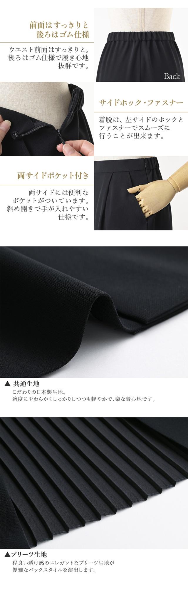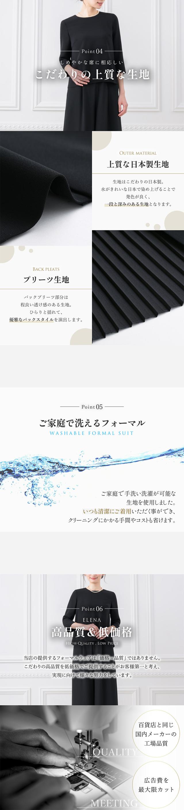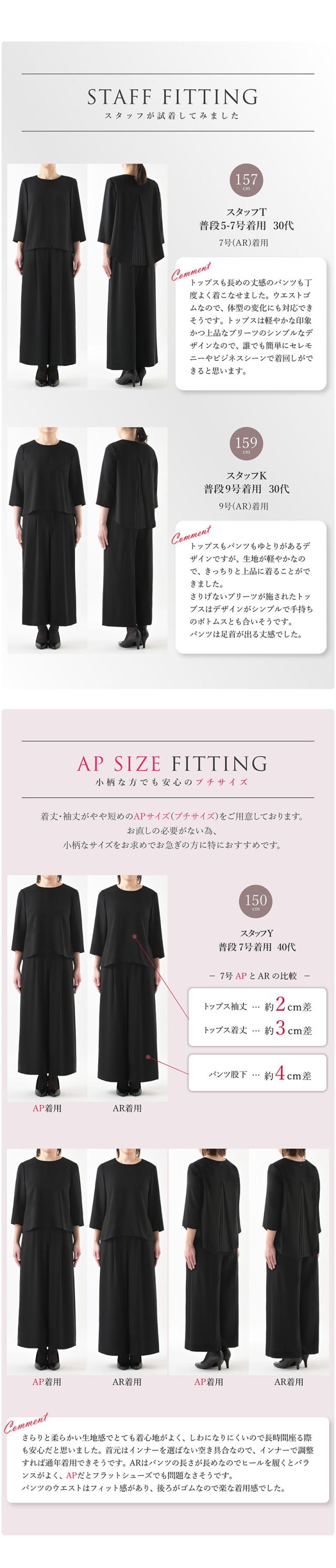 説明 | 礼服、喪服対応のブラックフォーマルスーツ。 トップス+パンツがセットになっており、着回しの効くセットアップです。 体のラインを拾わないので、年齡問わず着用でき長く使えるデザインに仕上げました。 トップスは、後ろ姿まで美しく魅せる、バックプリーツデザインがポイント。 パンツはフォーマルシーンに馴染む品のよい丈感がこだわりのワイドパンツです。 トップス、パンツ共に裏地なしで暑い時期にも涼しく着られます。 寒い時期はインナーの着用がおすすめです。 ご家庭で手洗い洗濯ができる、信頼性のある日本製生地を使用しているので、いつも清潔を保てます。 単品使いもできるので、お手持ちの洋服や小物と合わせることで抜群の着回し力を発揮し、 一着手許にあれば活躍すること間違いなしのアイテムです。 |