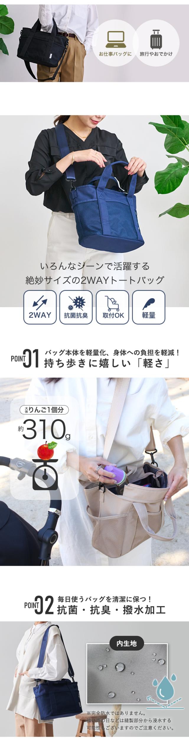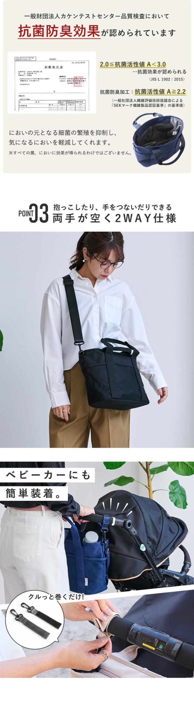 軽量・9つのポケット・抗菌防臭など こだわり機能が満載のメッシュポケット付きトート おむつや哺乳瓶などを入れて「ママバッグ」として。 お弁当箱やB5ノートなどを入れて「お仕事バッグ」として。 色々なシーンで活躍できる万能バッグ◎ トートとショルダーの使い分けができる2way仕様。 ショルダーがあると、抱っこの時やお子様とのお出かけにも便利です。 内生地に抗菌・防臭・撥水加工が施されているので 毎日使うバッグを清潔に保てます。 開口部が広いので出し入れしやすく、ファスナー開閉で防犯面も安心◎ 豊富な9ポケットで小物収納もばっちり! 内側には飲み物の温度を保てる保冷・保温のボトルポケットも付いています。 外側のメッシュポケットには、サッと取り出したいお子様のお菓子や スマホなどを入れておけて便利です。 付属のストラップでベビーカーや車の座席などに直接装着できます。 約310gの軽量バッグなので荷物をたくさん持ち歩く方でも 手や肩への負担も少なく持つ事ができます。 表地は、軽くて丈夫なポリエステル生地を使用しています。 水濡れや汚れにも強く、アクティブシーンでも大活躍! 年代を選ばないシンプルなデザインと、普段使いに丁度いいサイズ感で 幅広い方にお使い頂けます。 |