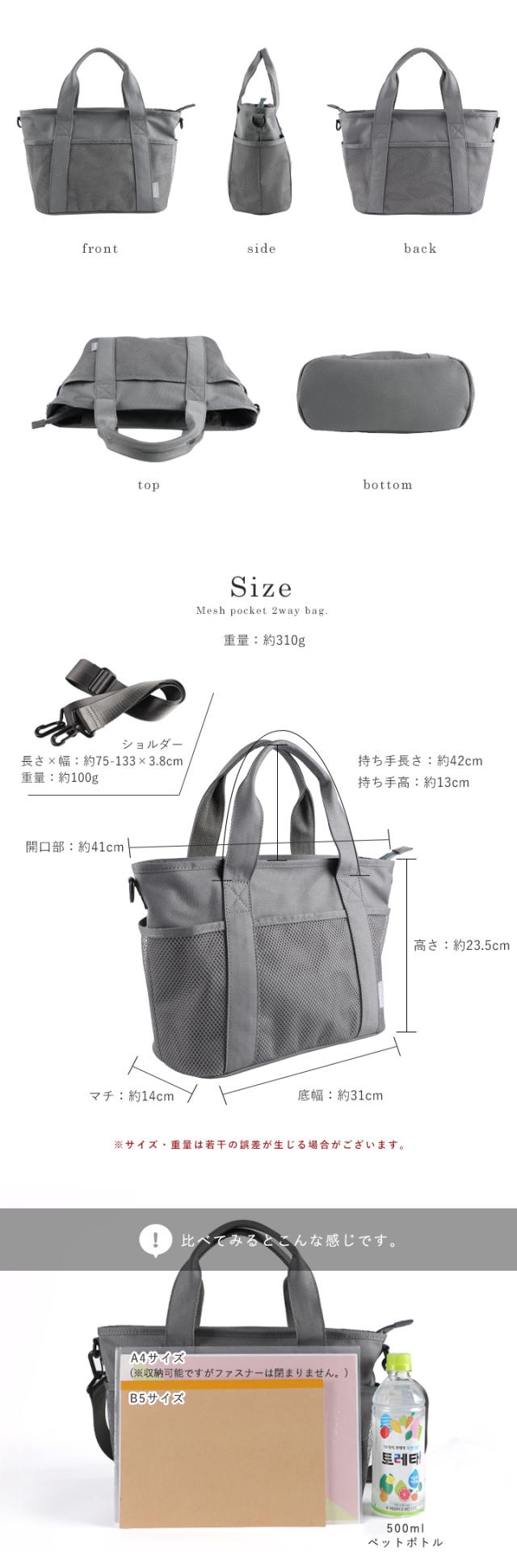 【サイズ(cm)】 開口幅:約41、底幅:約31、高さ:約23.5、マチ:約14、持ち手高:約16、持ち手長さ:約42 ショルダーベルト長さ×幅:約75-133×3.8 【重量(g)】 [本体]310 [ショルダー]100 【仕様】 開閉:ファスナー 内側:オープンポケット×3、ファスナーポケット×1、ボトルポケット×1 外側:メッシュポケット×4 【素材】 ポリエステル 【収納可能サイズ】 B5 ※A4は収納可能ですが、ファスナーは閉まりません ※ハンドルの「持ち手」サイズは、縫い目からの採寸サイズです ※サイズは当店平置き外寸サイズです。タグの表記とは異なる場合があります。 製品による個体差がある場合がございますので予めご了承下さい。 |