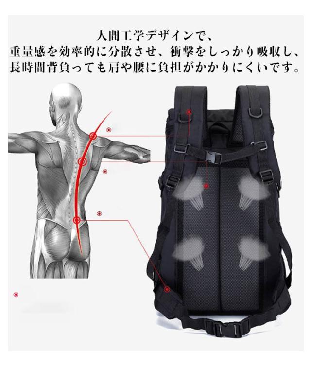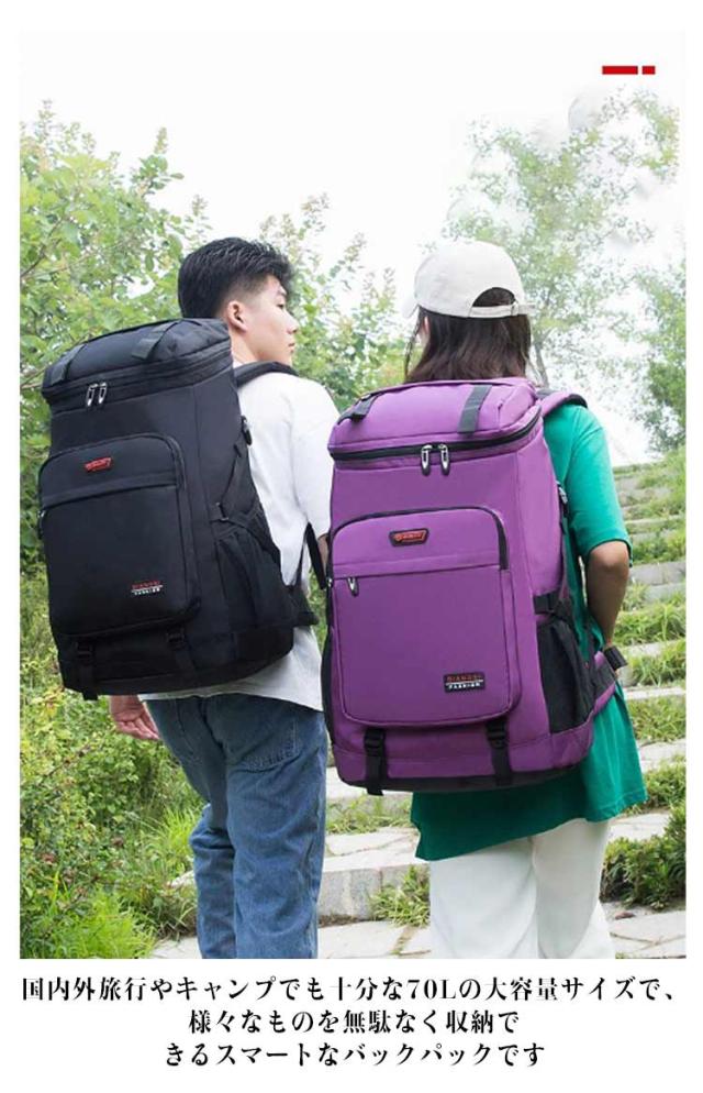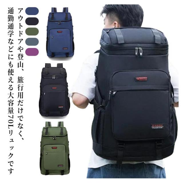 | アウトドアや登山、旅行用だけでなく、通勤通学などにも使える大容量70Lリュックです 国内外旅行やキャンプでも十分な70Lの大容量サイズで、様々なものを無駄なく収納できるスマートなバックパックです すっきりとした整理と使用が可能な収納システムで、実用的な使用動線と乱れにくい収納をお届けします。 人間工学デザインで、重量感を効率的に分散させ、衝撃をしっかり吸収し、長時間背負っても肩や腰に負担がかかりにくいです。 また、肩と背部にはクッション性の高いハニカムメッシュを採用し、通気性にも優れています。 摩擦や破れに耐え、丈夫であるという特徴を備えているのに加え、超強力な防水性能を持っていて、小さな水滴の沁み込みをも防ぎます。 普段使いはもちろん、旅行・合宿・キャンプ・出張・登山など、あらゆる場面で活躍できます。 | |