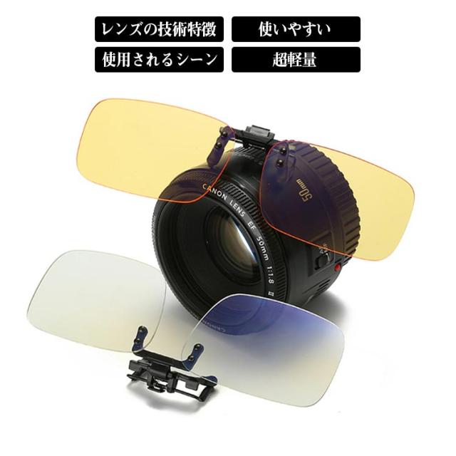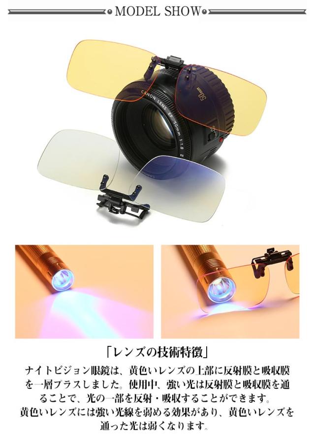 | 「レンズの技術特徴」ナイトビジョン眼鏡は、黄色いレンズの上部に反射膜と吸収膜を一層プラスしました。使用中、強い光は反射膜と吸収膜を通ることで、光の一部を反射・吸収することができます。黄色いレンズには強い光線を弱める効果があり、黄色いレンズを通った光は弱くなります。 「使いやすい」クリップは眼鏡の間で挟むことができて、すばやくあなたの近視の眼鏡の上で貼り付けて、めくって、使用して便利です。それ以来眩しさを心配する必要はありません通常のサングラスよりも簡単に切り替えられます 「超軽量」お使いにならない時は、レンズを跳ね上げておくことが出来ます。わずか18gの超軽量、耐久性に優れた材料を採用して、日本人の顔にフィットする設計。 「安全性」可視光線透過率が89%あるためトンネル内でも暗くなく、夜間運転時(視感透過率75% 以上必要)の使用が可能。 「使用されるシーン」夜間、或いは雨、霧、曇りの天候の際にご着用頂くことにより、視野を良くし、より明るくてクリアな視界となります。夜間の運転中の対向車のライトなどの強い光を緩和する効果があり、運転の安全性を高めます。 | |