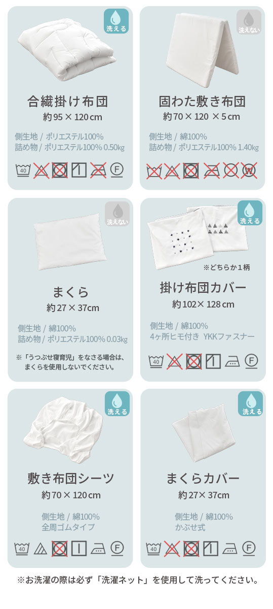 | お手入れ | 〇赤ちゃんは汗かきです。ときどき日に干すか布団乾燥機で乾燥させ、衛生的に保ちましょう。 〇掛け布団をお洗濯の際は必ず洗濯ネットをご使用の上、高水位で単独で洗ってください。 〇敷き布団・まくらは洗えません。 〇痛みや汚れを防ぐため、カバーやシーツを掛けてお使いください。 〇敷き布団は衛生的に保つため、キルトパットや防水シーツの併用をお薦めします。 |