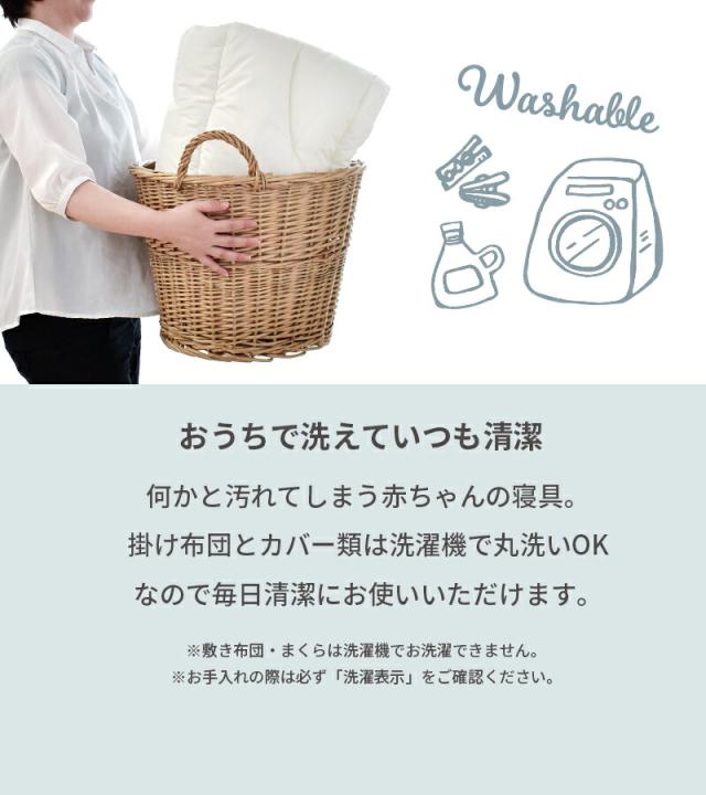 | お手入れ | 〇赤ちゃんは汗かきです。ときどき日に干すか布団乾燥機で乾燥させ、衛生的に保ちましょう。 〇掛け布団をお洗濯の際は必ず洗濯ネットをご使用の上、高水位で単独で洗ってください。 〇敷き布団・まくらは洗えません。 〇痛みや汚れを防ぐため、カバーやシーツを掛けてお使いください。 〇敷き布団は衛生的に保つため、キルトパットや防水シーツの併用をお薦めします。 |