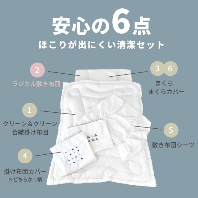 | セット内容 | 合繊掛け布団 /ラジカル敷き布団 / まくら / 掛け布団カバー / 敷き布団シーツ / まくらカバー |