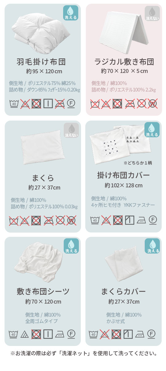 | セット内容 | 羽毛掛け布団 / ラジカル敷き布団 / まくら / 掛け布団カバー / 敷き布団シーツ / まくらカバー |